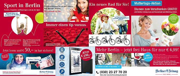 www.berliner-zeitung.deProduktwerbung: Anzeigen, Flyer, Beilagen, Flying Page, Online-Grafiken mit wechselnden Content für den Lesermarkt und das Abomarketing.